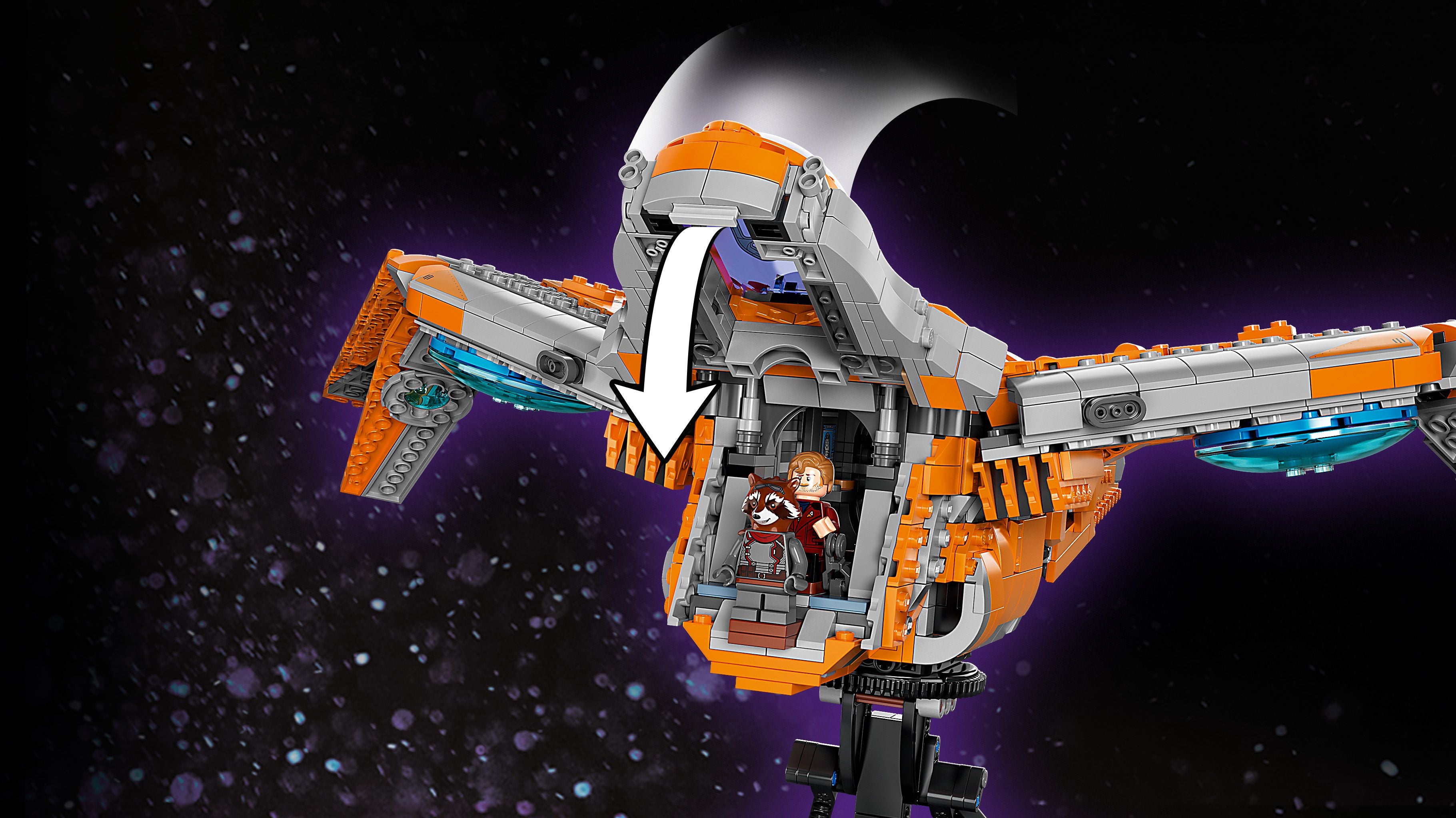 - Open the cockpit and let all the LEGO® Marvel minifigures (Star-Lord, Groot, Rocket, Mantis, Thor and a Chitauri warrior) come in.