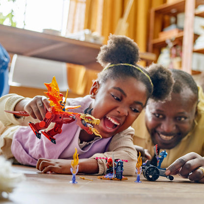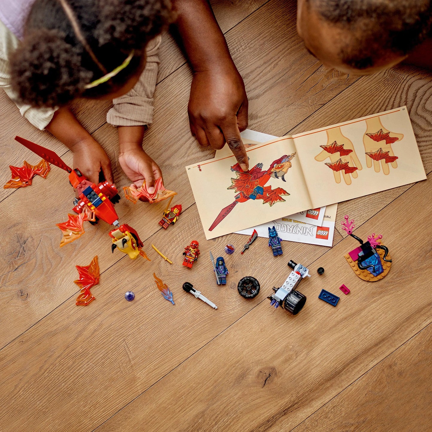 Met de speelset LEGO® NINJAGO® Kai's brondrakenstrijd (71815) leren kinderen vanaf 4 jaar bouwen terwijl ze spannende ninja-avonturen beleven in het NINJAGO universum. Dit actiespeelgoed bestaat uit een rode draak die kinderen kunnen verstellen door de kaak, kop, staart, poten en 4 vleugels te bewegen. Kinderen kunnen ook een vuurelement in zijn bek plaatsen om schurken bang te maken.