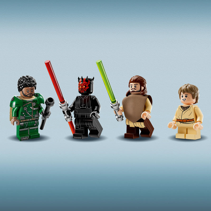• 4 LEGO® Star Wars™ minifiguren: Darth Maul met zijn dubbelzijdige lichtzwaard, Qui-Gon Jinn, een Bothan Spion en een LEGO® Star Wars™ 25th Anniversary minifiguur.